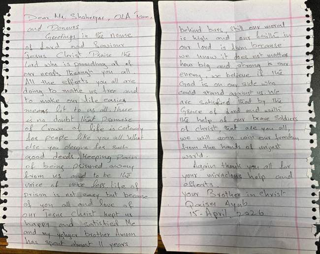 "Greetings in the name of Lord and Saviour Jesus Christ. Praise the Lord who is providing all of our needs through you all. All the efforts you all are doing to make us free and to make our life easier means lot to us all. There is no doubt that promise of crown of life is certainly for people like you all. What else you deserve for such good deeds, keeping pain of being imprisoned away from us, and to be the voice of voiceless. Life in prison is not easy, but you all and love of our Jesus Christ kept us happy and satisfied. Me and my younger brother Amoon have spent almost 11 years behind bars. Still our morale is high and our faith in our Lord is firm because we know it does not matter how big and strong is our enemy. We believe if God is on our side, who could stand against us? We are satisfied that by the grace of Lord and with the help of our brave soldiers of Christ, that are you all, we will soon win our freedom from the hands of unjust world.