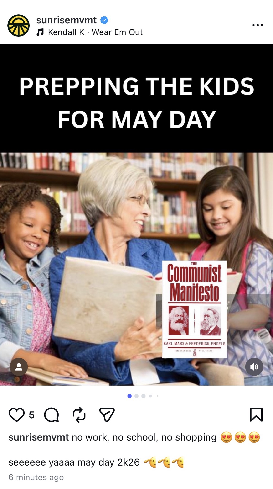 If Sunrise Movement has not been clear about what it specifically means by “political revolution,” a recent May Day social media post features an image of an adult reading "The Communist Manifesto" to children.